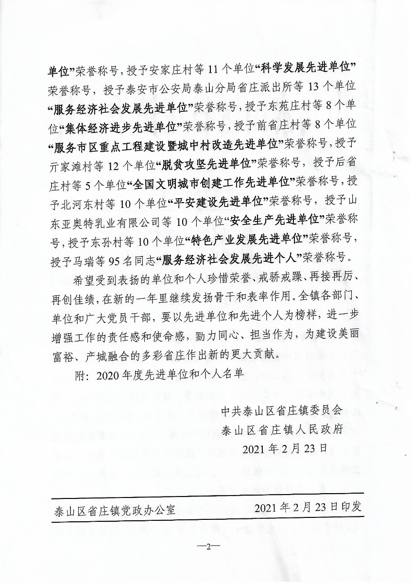 近日,中共泰山區(qū)省莊鎮(zhèn)委員會、泰山區(qū)省莊鎮(zhèn)人民政府為突出貢獻的2020年度先進單位予以表彰。共10家企業(yè)獲評“稅收貢獻先進單位”,泰安德美機電榜上有名。