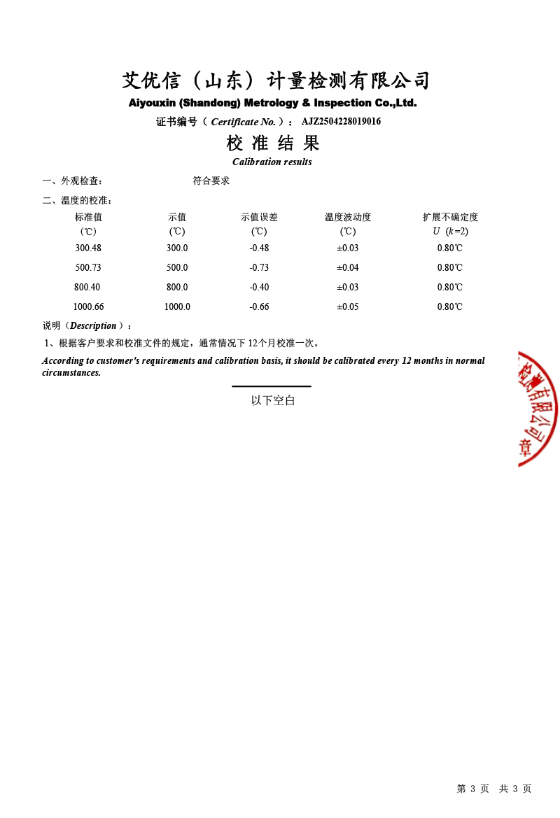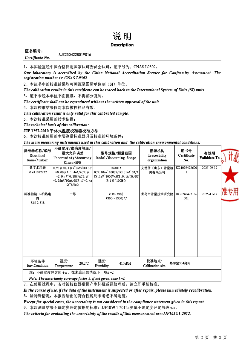 干體溫度校驗爐(300-1200℃)校準證書 2025-4-24 本文被閱讀 3718 次