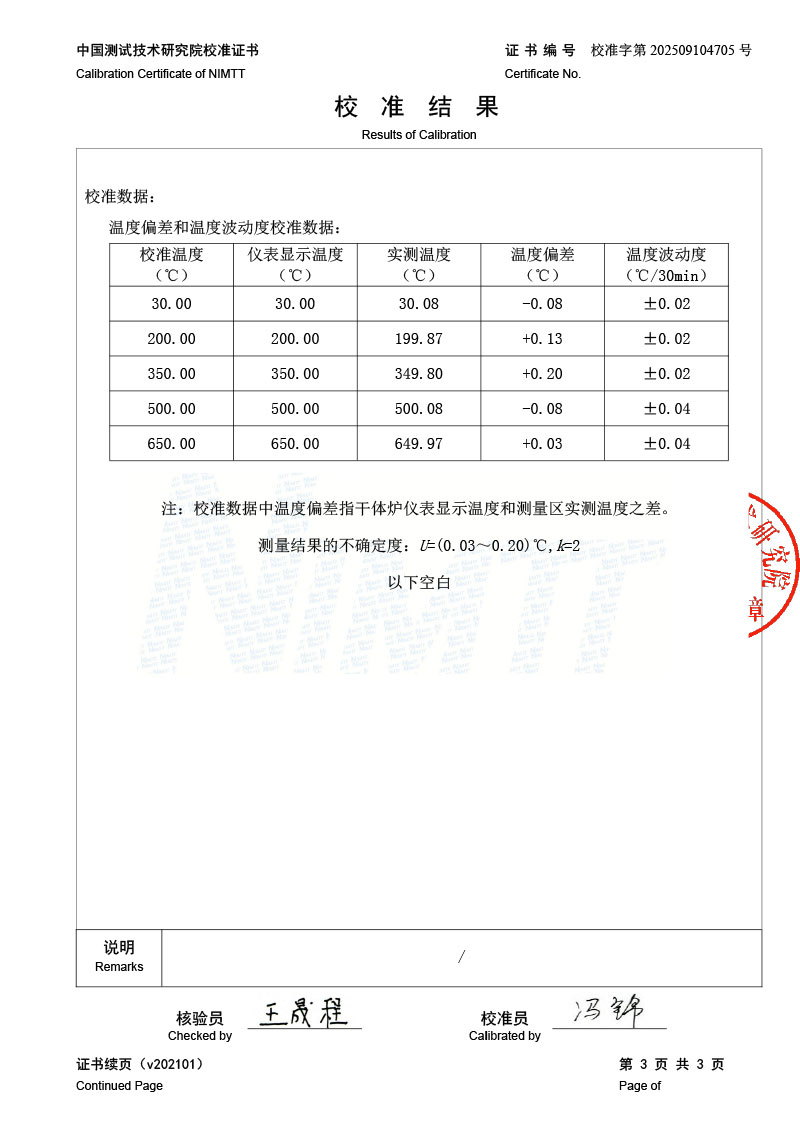 中溫干體爐(30-650℃)校準(zhǔn)證書