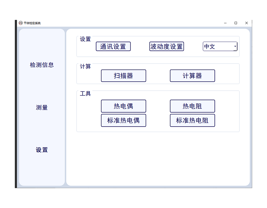 測(cè)量狀態(tài)可進(jìn)行多通道狀態(tài)干體爐,萬(wàn)用表讀數(shù)。當(dāng)前標(biāo)準(zhǔn)器溫度,溫度波動(dòng)性等數(shù)據(jù)的讀取,并一鍵生成證書??蓪?shí)現(xiàn)一鍵中英文切換。