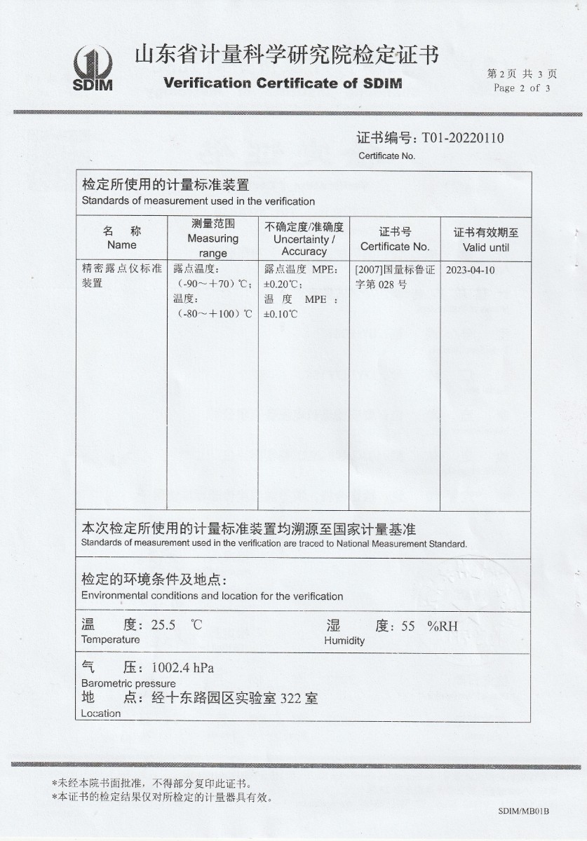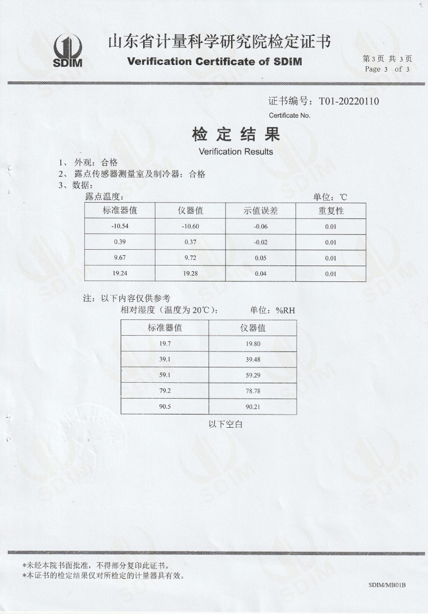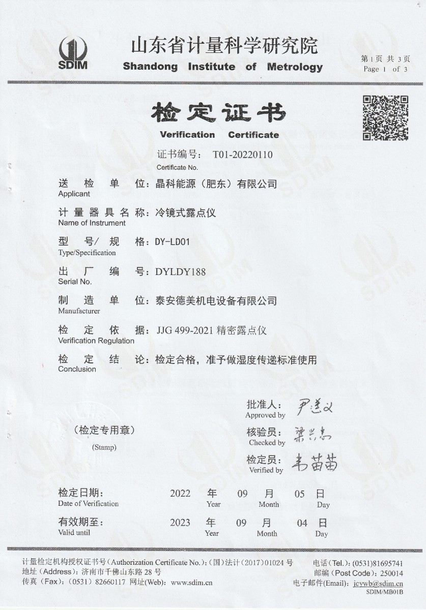 晶科能源(肥東)有限公司-冷鏡式露點儀檢定證書 2022-9-26 本文被閱讀 16498 次