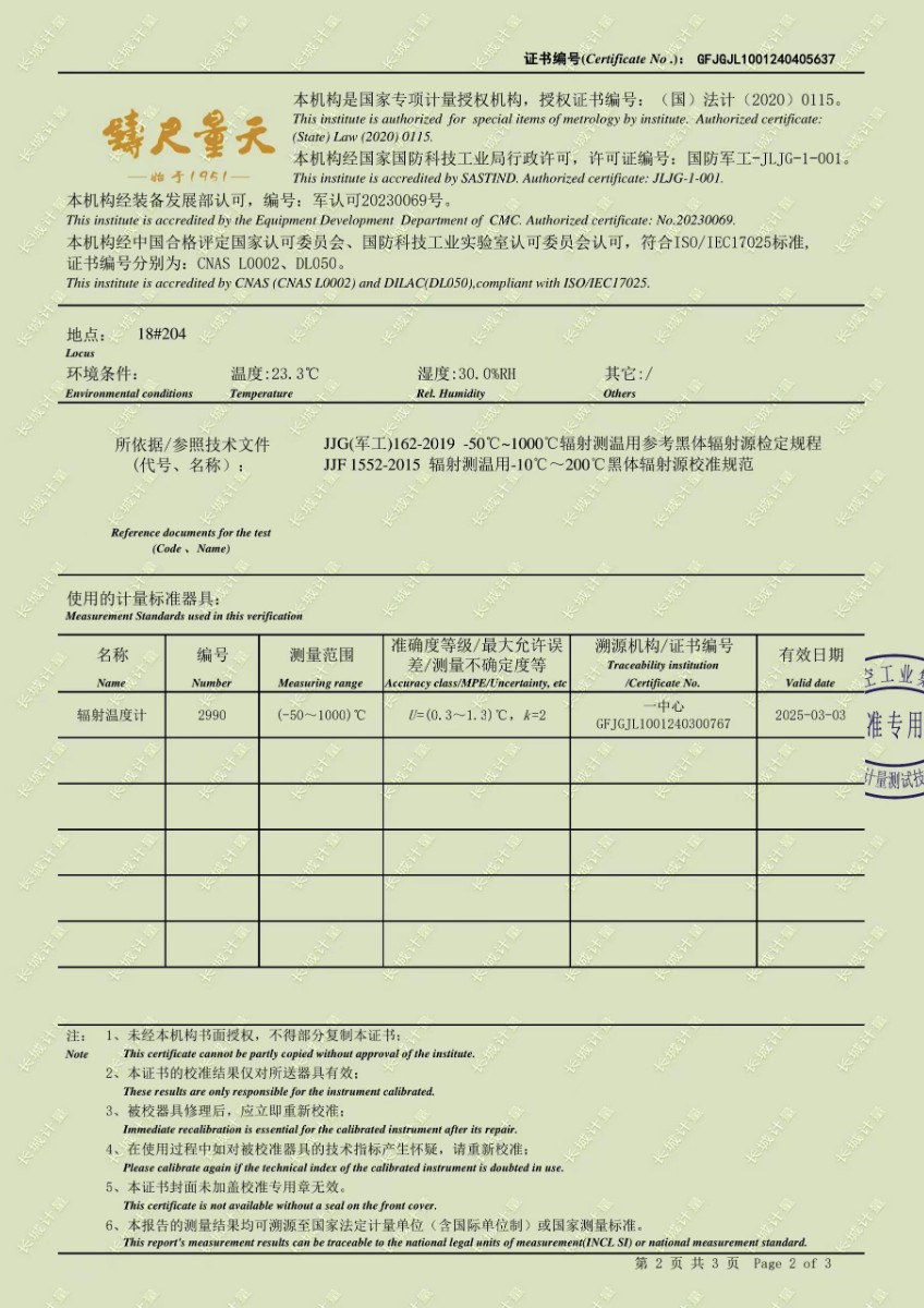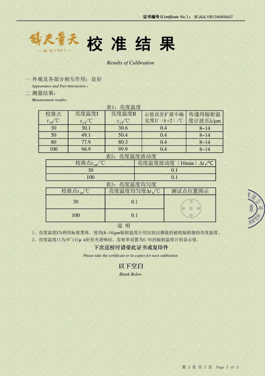 高精度中溫黑體校準證書 2024-4-24 本文被閱讀 7370 次