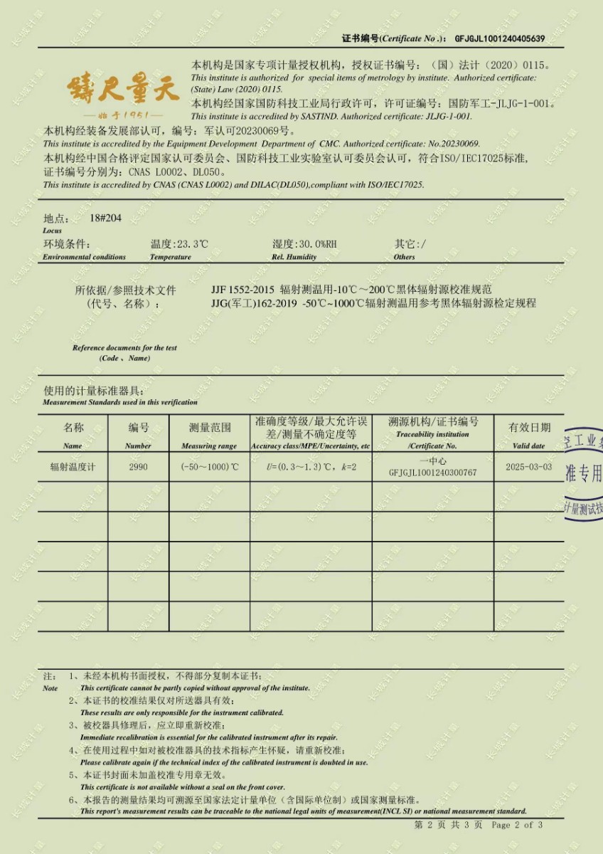黑體爐校準(zhǔn)證書 2024-4-24 本文被閱讀 9552 次