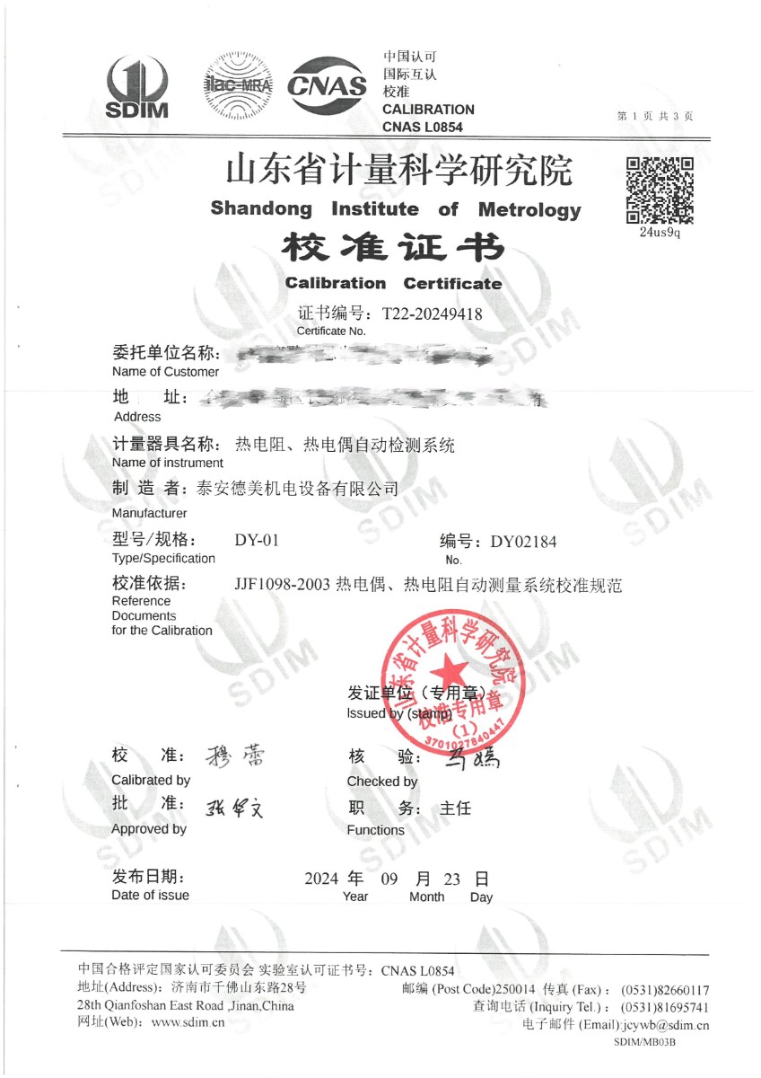 熱電阻、熱電偶自動檢測系統(tǒng)校準證書 2024-9-24 本文被閱讀 8223 次