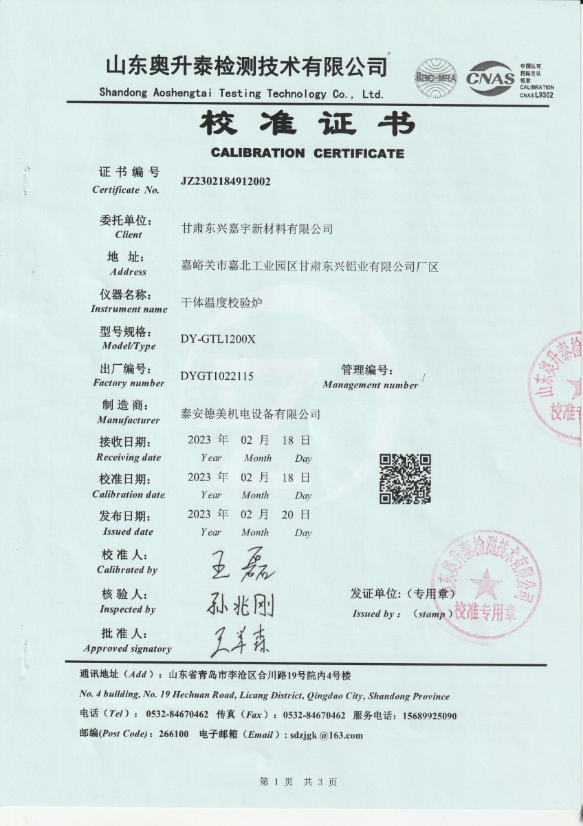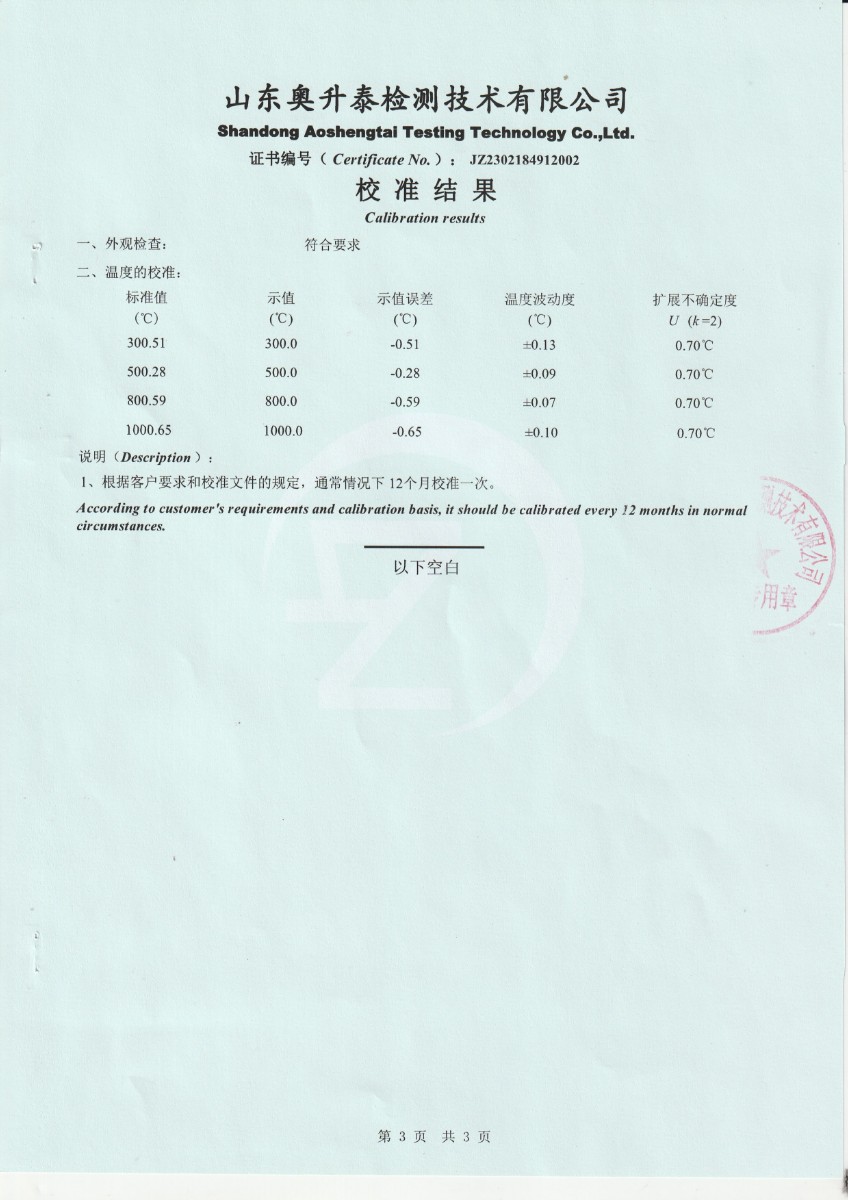 | 上一條:甘肅東興嘉宇新材料有限公司 干體溫度校驗(yàn)爐 校準(zhǔn)證書(1) | 下一條:水三相點(diǎn)瓶凍制與保存裝置校準(zhǔn)證書 |