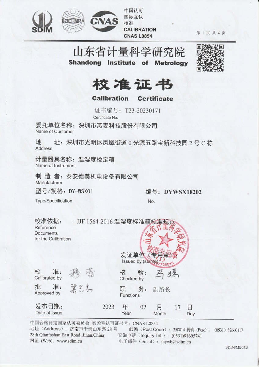 深圳市燕麥科技股份有限公司 溫濕度檢定箱 校準(zhǔn)證書 2023-3-2 本文被閱讀 14667 次