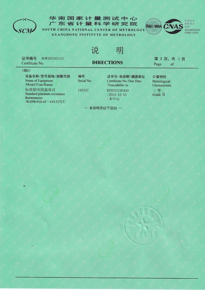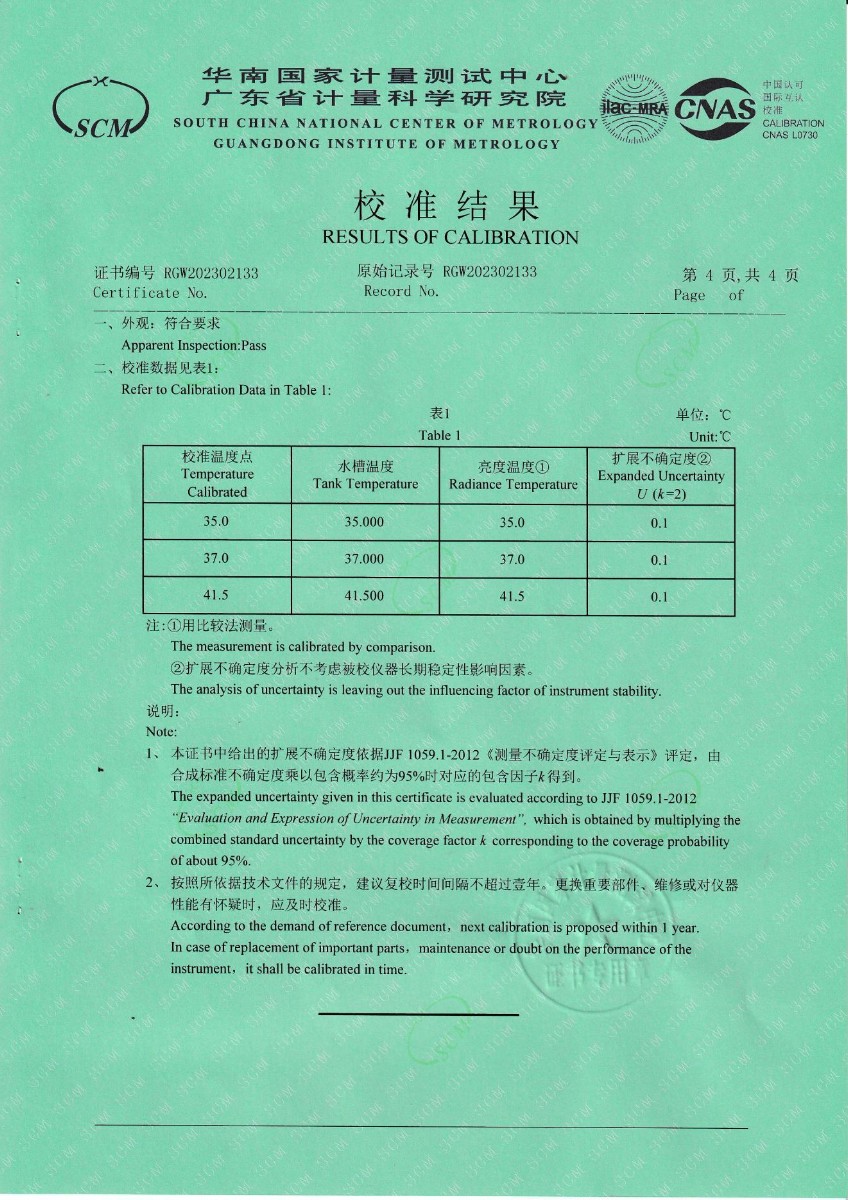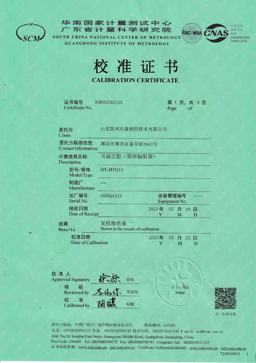 | 上一條:山東凱利布森測(cè)控技術(shù)有限公司 額溫空腔(黑體輻射源) 校準(zhǔn)證書 | 下一條:水三相點(diǎn)瓶?jī)鲋婆c保存裝置校準(zhǔn)證書 |