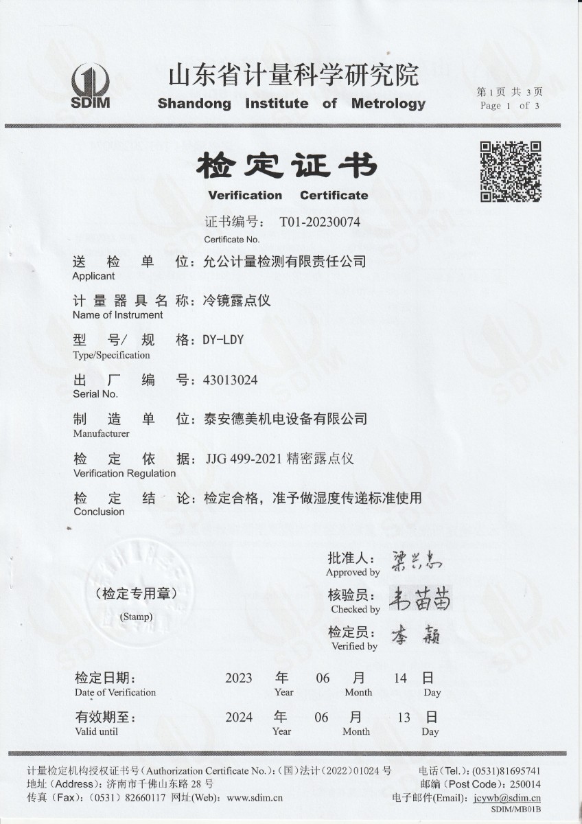 允公計(jì)量檢測有限責(zé)任公司-冷鏡露點(diǎn)儀檢定證書 2023-6-25 本文被閱讀 19134 次