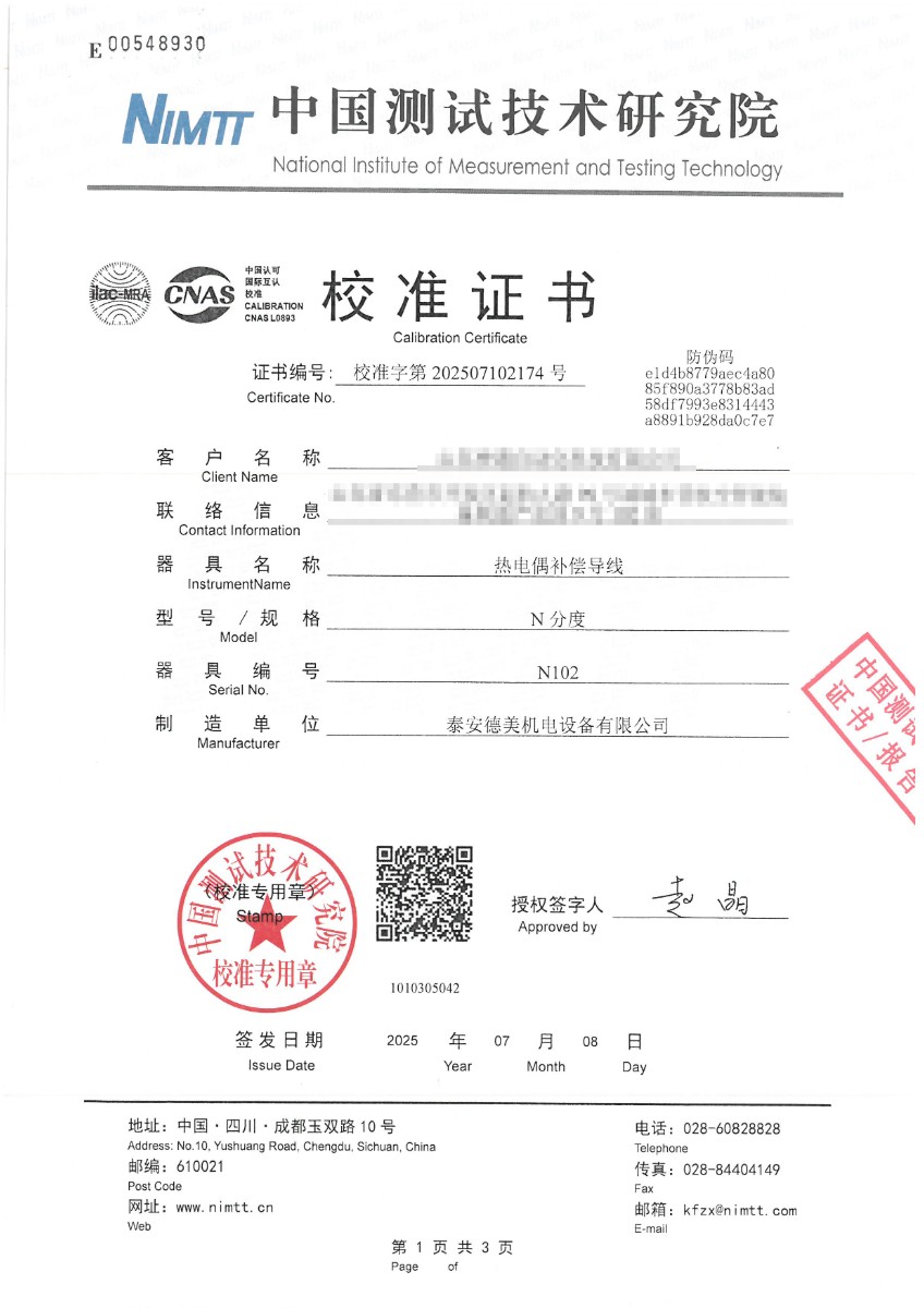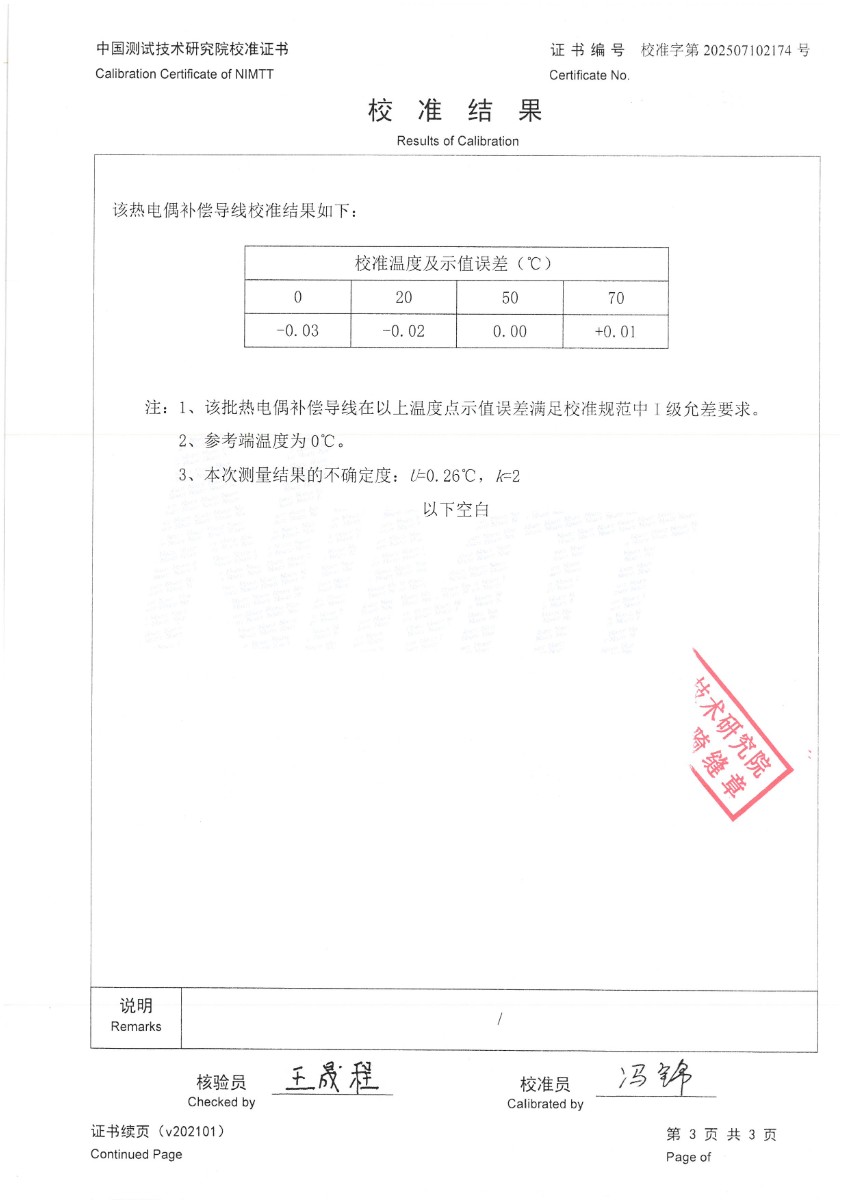 熱電偶補償導線(N分度)校準證書 2025-7-10 本文被閱讀 3208 次