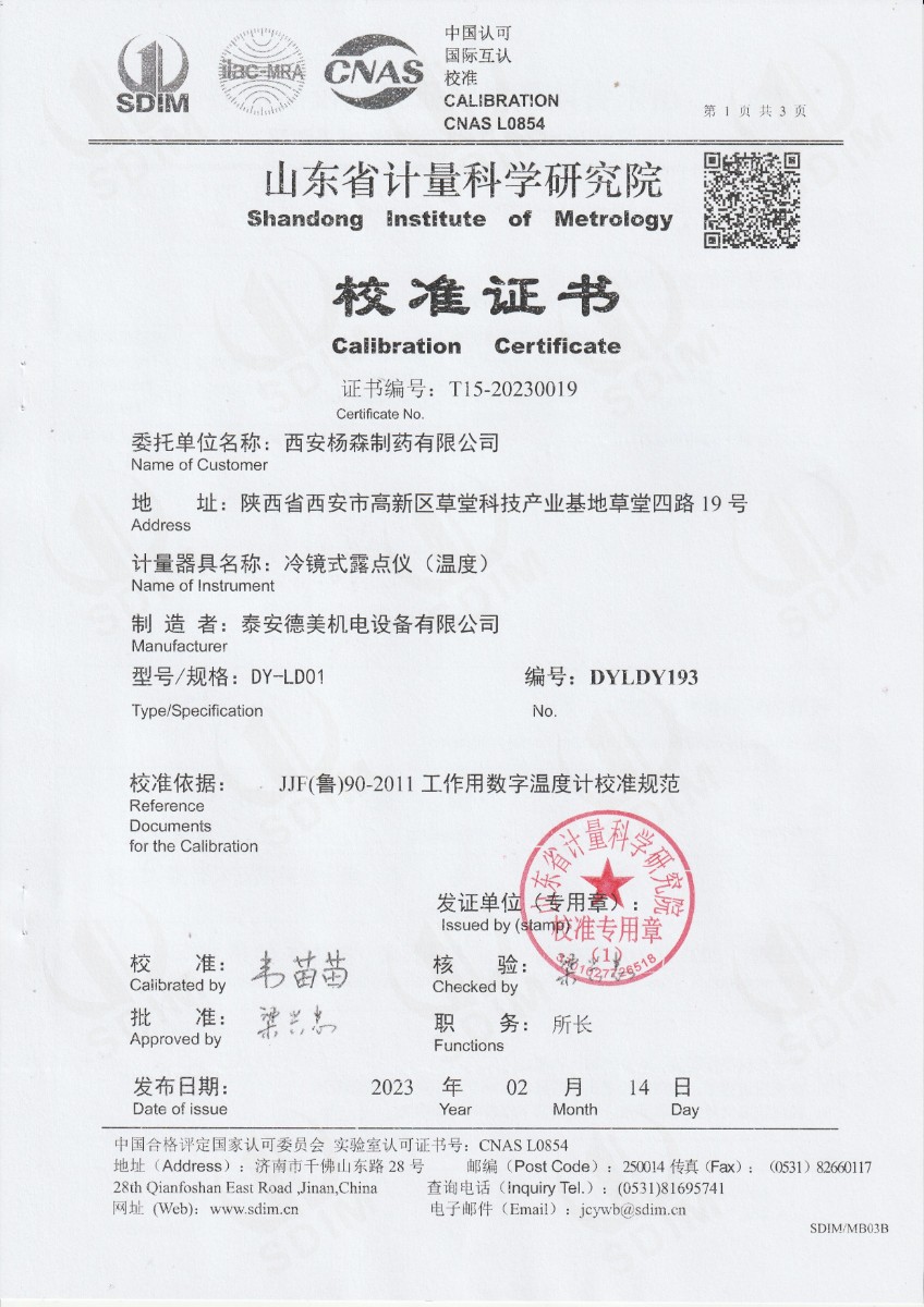 | 上一條:西安楊森制藥有限公司 冷鏡式露點(diǎn)儀 檢定證書(shū) | 下一條:水三相點(diǎn)瓶?jī)鲋婆c保存裝置校準(zhǔn)證書(shū) |
