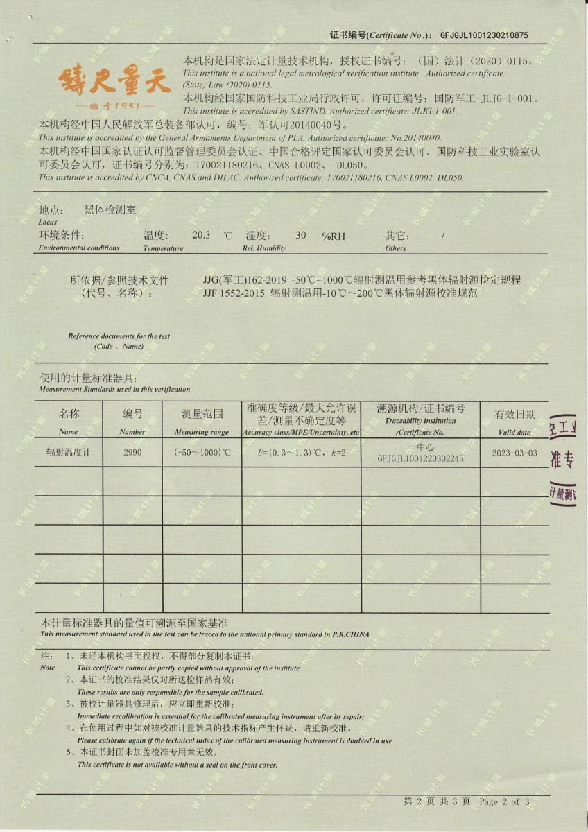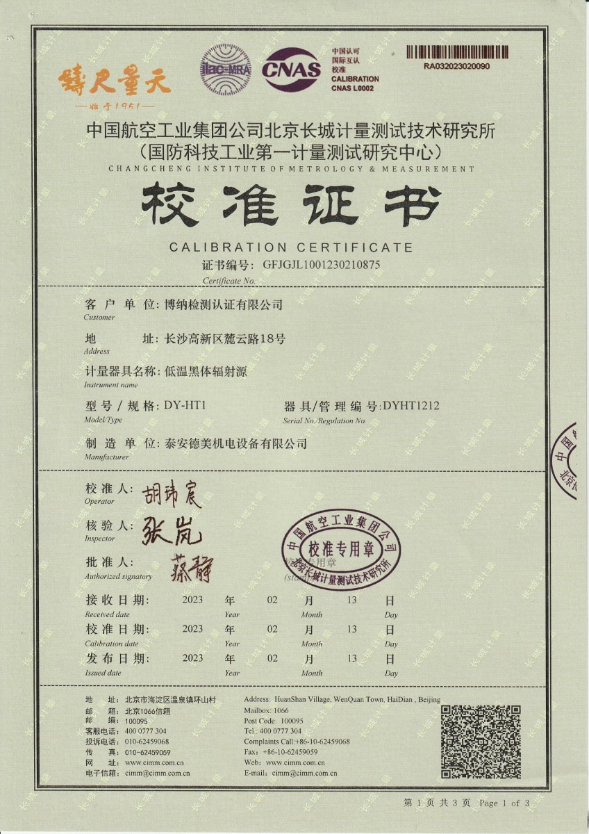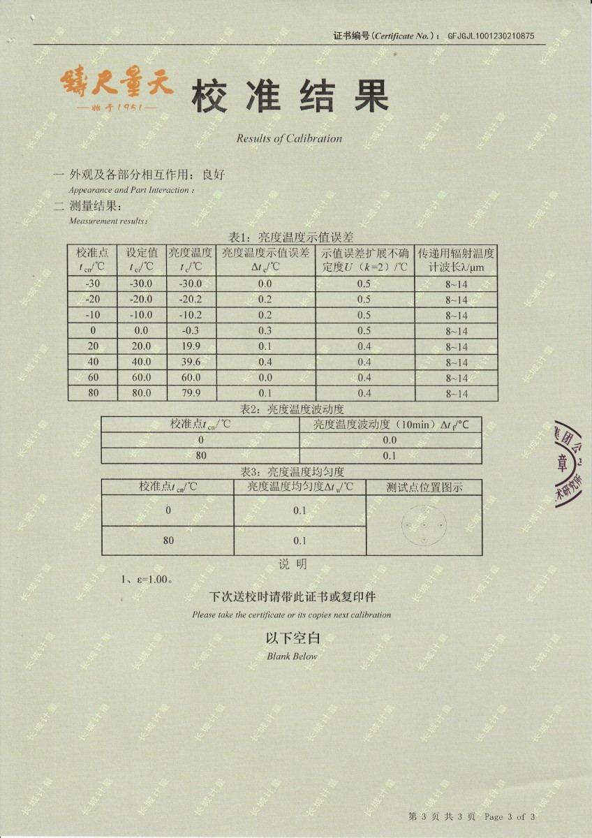 | 上一條:晶科能源(海寧)有限公司 冷鏡式露點(diǎn)儀(溫度) 校準(zhǔn)證書 | 下一條:水三相點(diǎn)瓶凍制與保存裝置校準(zhǔn)證書 |