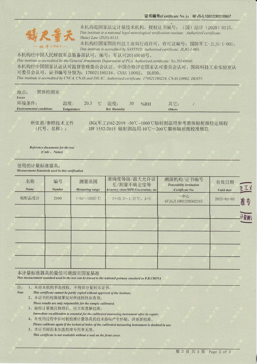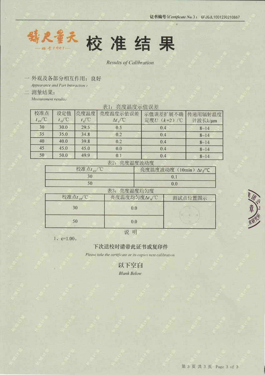 | 上一條:江蘇省產(chǎn)品質(zhì)量監(jiān)督檢驗(yàn)研究院 黑體輻射源 校準(zhǔn)證書 | 下一條:水三相點(diǎn)瓶?jī)鲋婆c保存裝置校準(zhǔn)證書 |