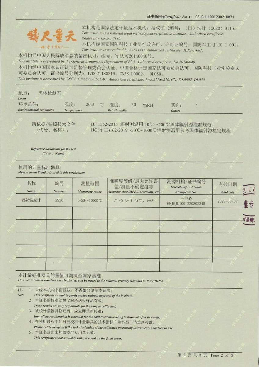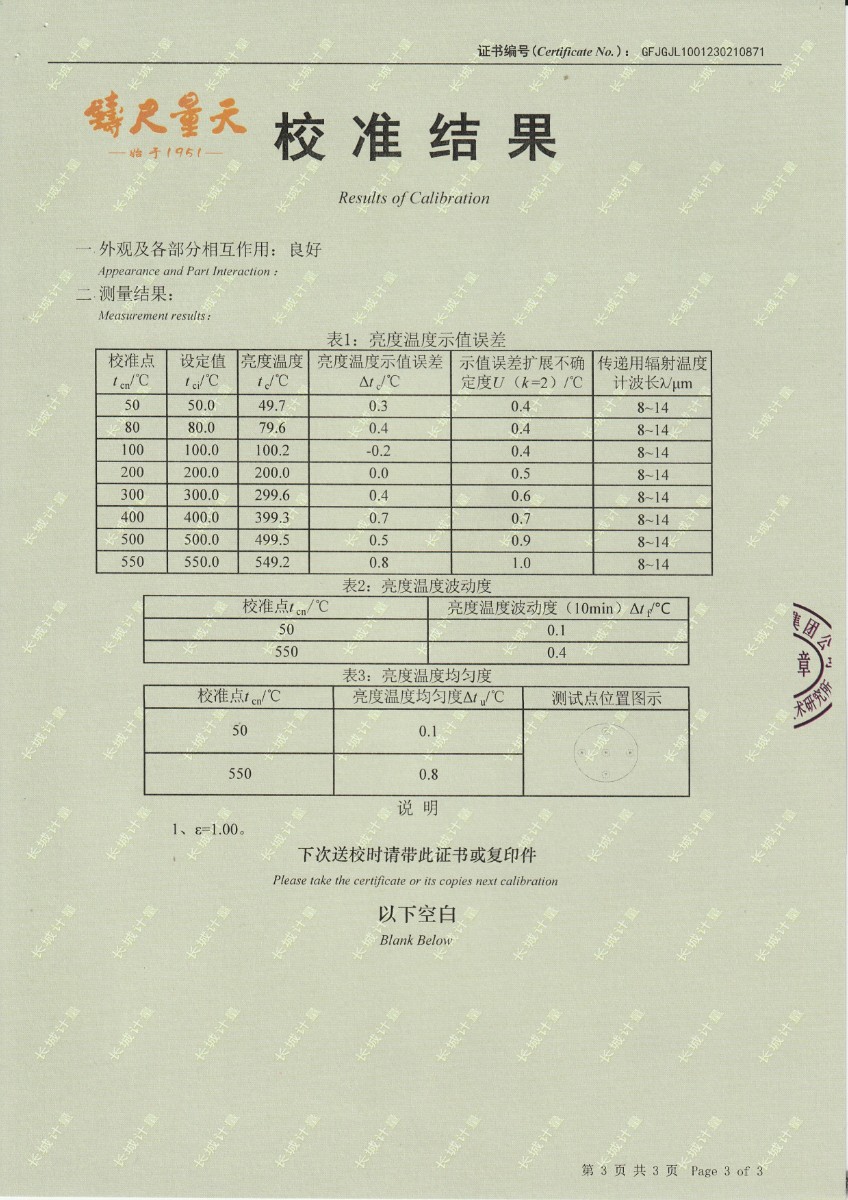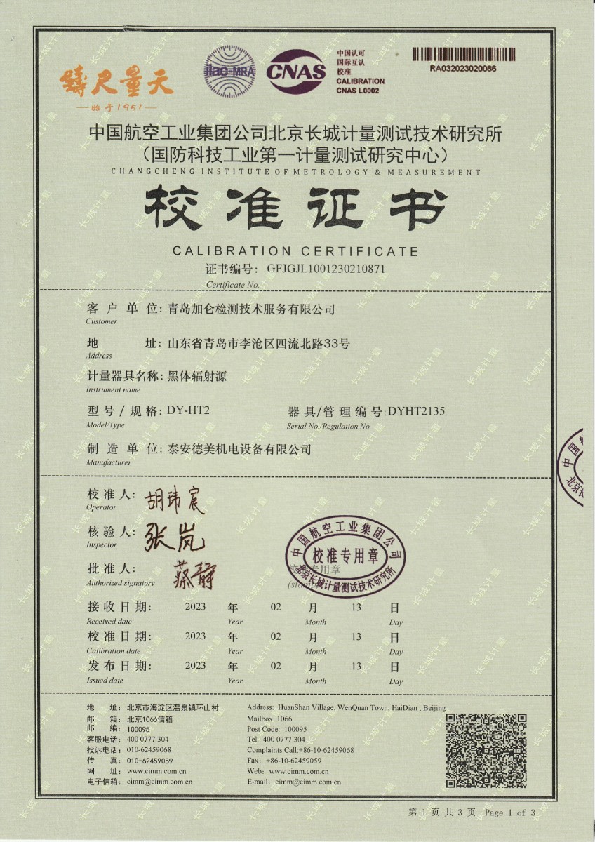 青島加侖檢測技術(shù)服務有限公司 黑體輻射源 校準證書 2023-2-25 本文被閱讀 13981 次