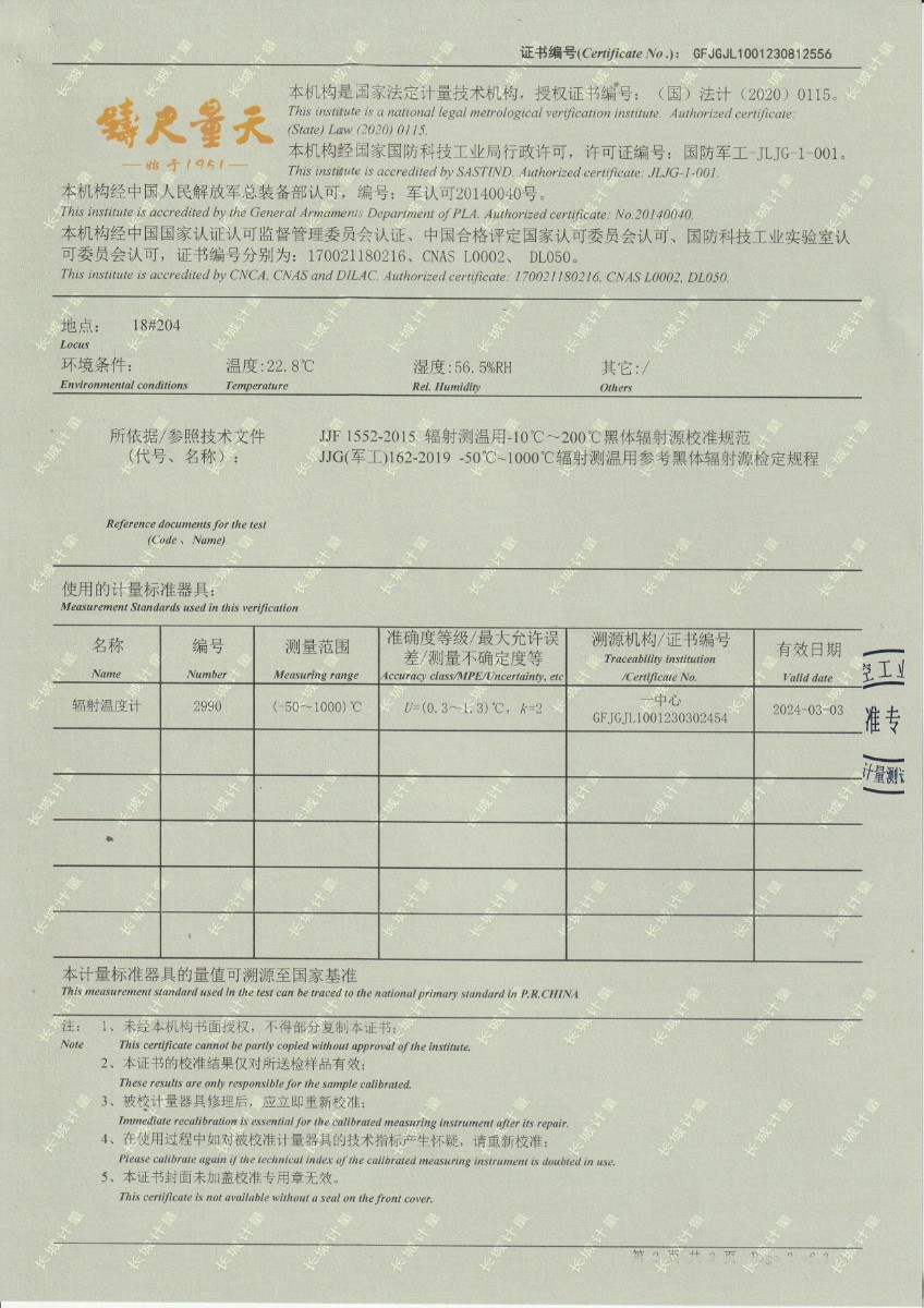 面源黑體爐DYHT1M140校準證書 2023-9-20 本文被閱讀 10950 次