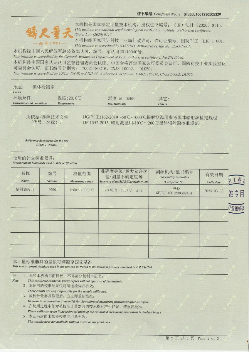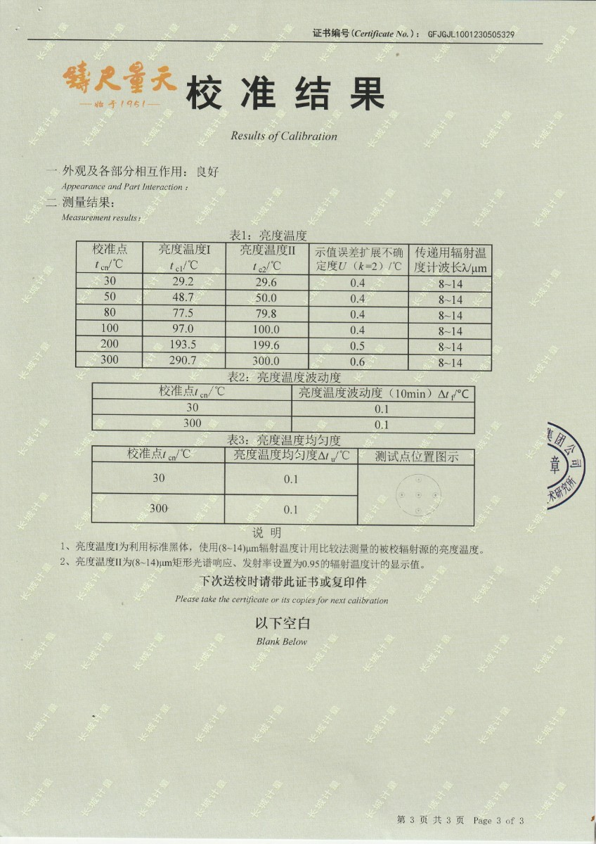| 上一條:淮安捷泰新能源科技有限公司 黑體輻射源 校準(zhǔn)證書 | 下一條:水三相點瓶凍制與保存裝置校準(zhǔn)證書 |