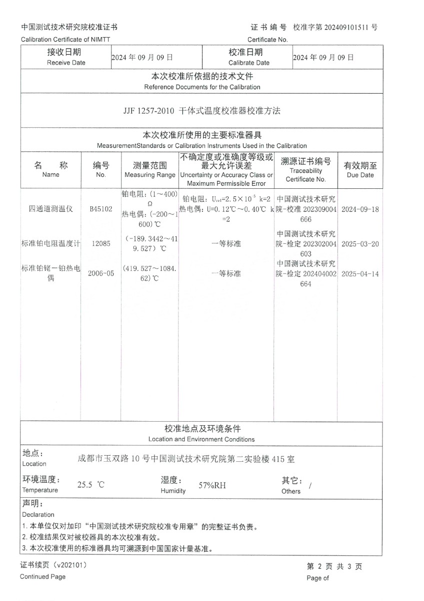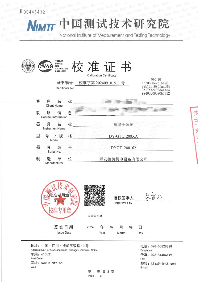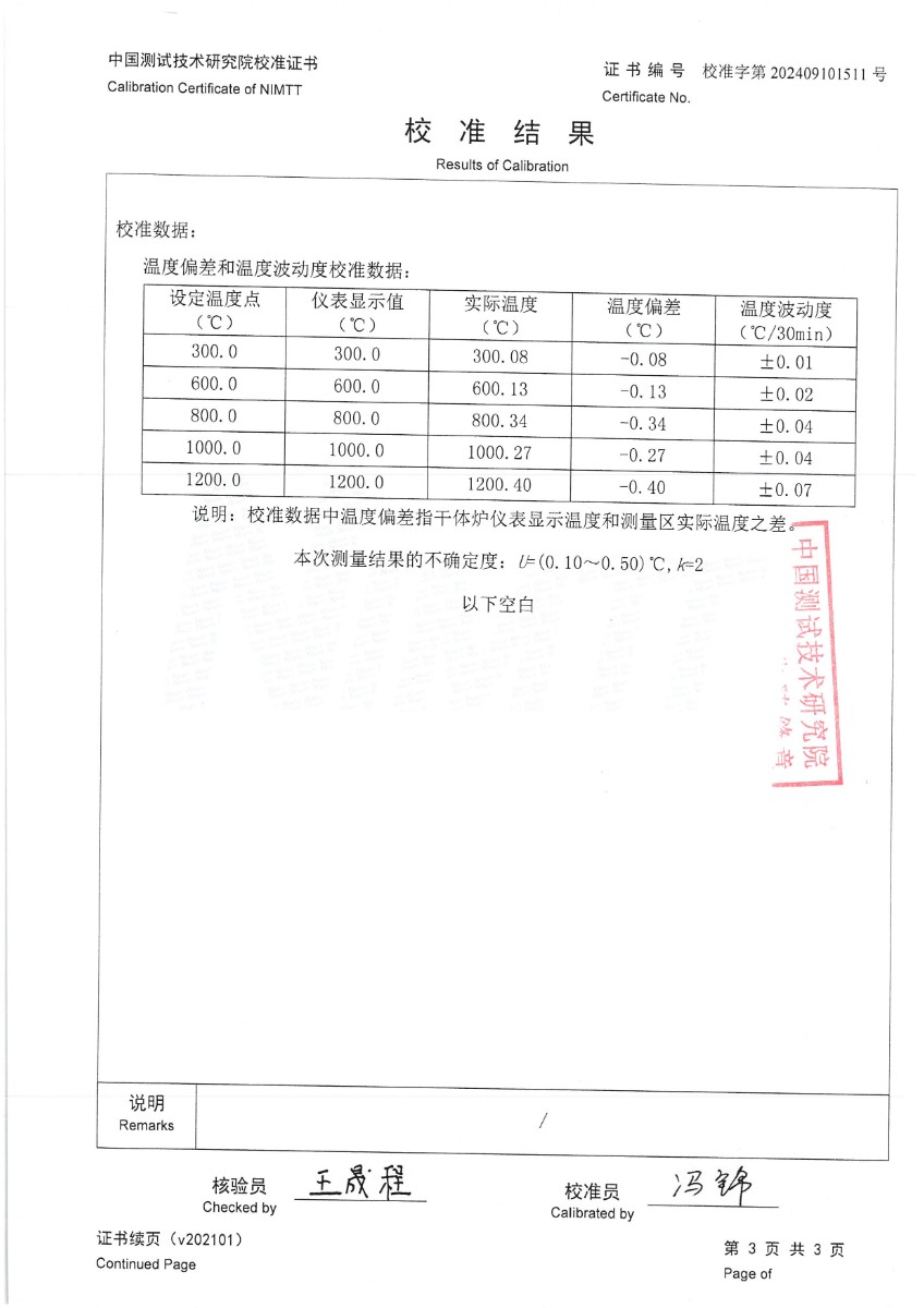 高溫干體爐(300~1200℃)校準證書 2024-9-11 本文被閱讀 6852 次