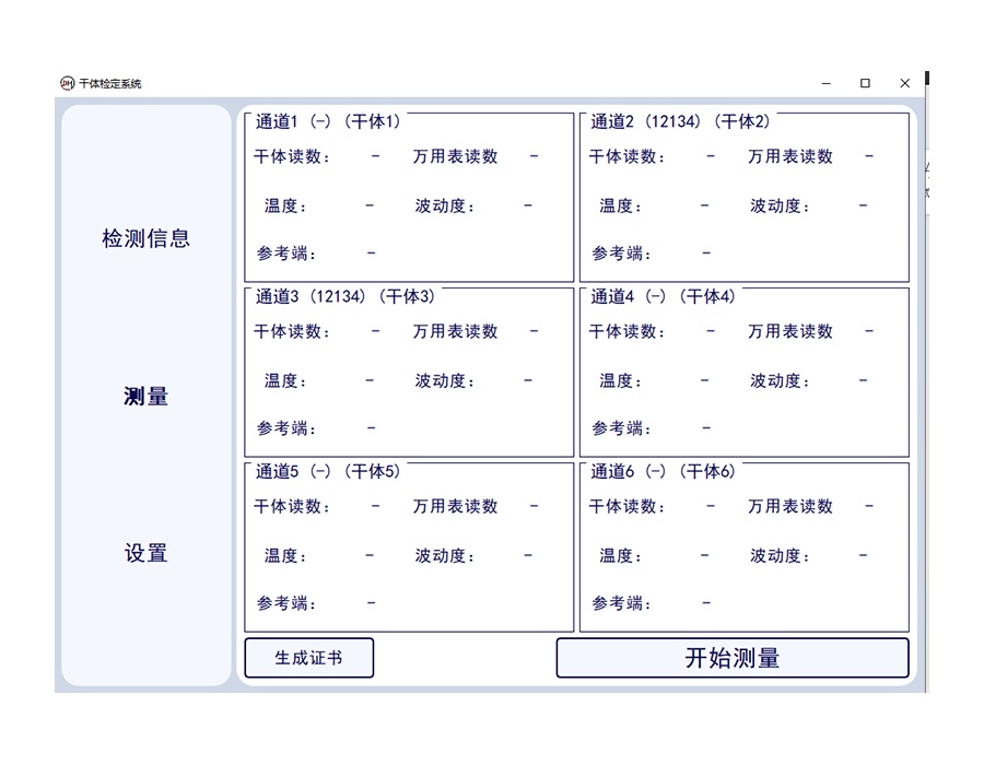 測(cè)量狀態(tài)可進(jìn)行多通道狀態(tài)干體爐,萬用表讀數(shù)。當(dāng)前標(biāo)準(zhǔn)器溫度,溫度波動(dòng)性等數(shù)據(jù)的讀取,并一鍵生成證書。可實(shí)現(xiàn)一鍵中英文切換。