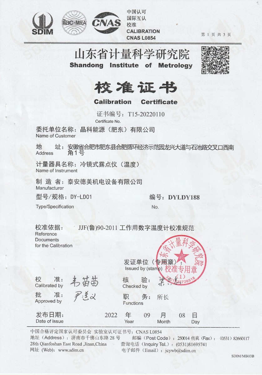 | 上一條:晶科能源(肥東)有限公司-冷鏡式露點儀檢定證書 | 下一條:溫度數(shù)據(jù)采集儀校準(zhǔn)證書 |