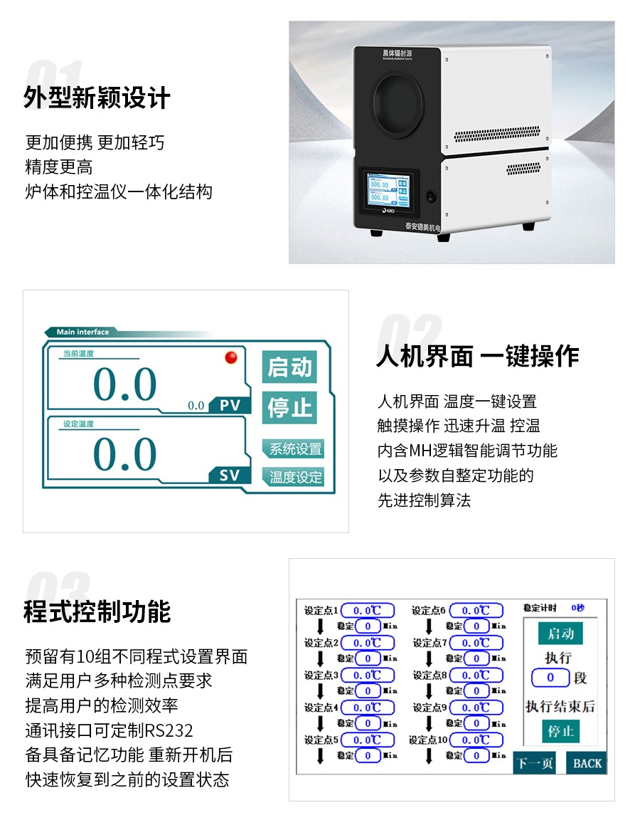 標(biāo)準(zhǔn)黑體作為標(biāo)準(zhǔn)輻射源,主要用于校準(zhǔn)輻射溫度計、紅外溫度計和輻射溫度傳感探測器。我公司目前具有先進(jìn)的黑體技術(shù),產(chǎn)品種類全、溫度范圍寬的黑體系列產(chǎn)品。產(chǎn)品體積小、重量輕、便于攜帶,不僅適合各級計量機(jī)構(gòu)實驗室校準(zhǔn)輻射溫度計使用,同時可以用于現(xiàn)場校準(zhǔn)。