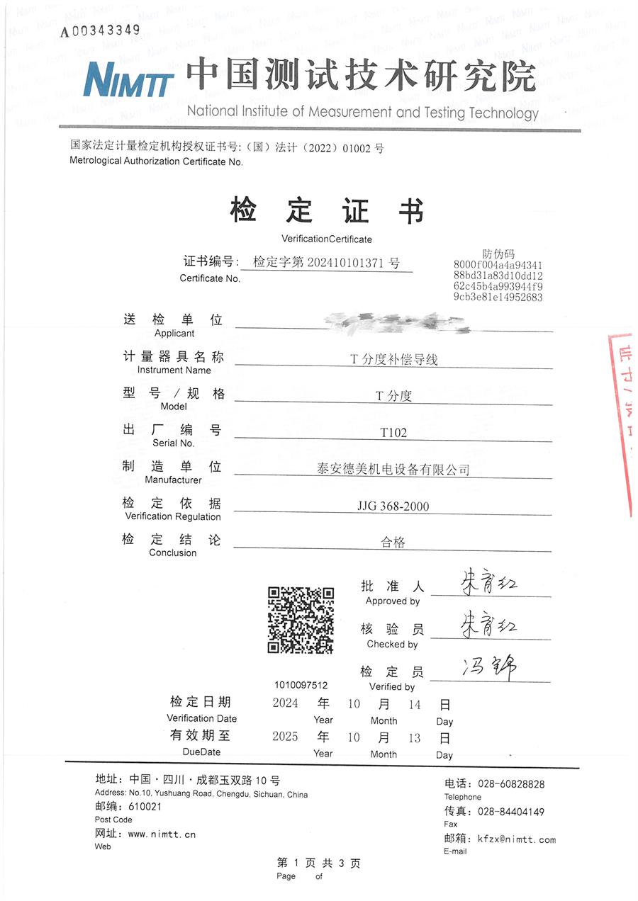| 上一條:面源黑體爐(室溫+5-300℃)校準(zhǔn)證書(shū) | 下一條:溫度數(shù)據(jù)采集儀校準(zhǔn)證書(shū) |