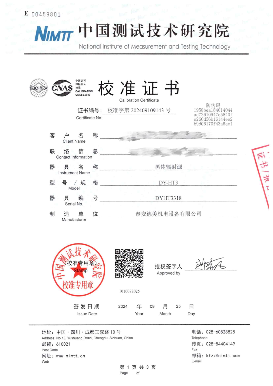 高溫腔式黑體校準證書 2024-10-21 本文被閱讀 7709 次