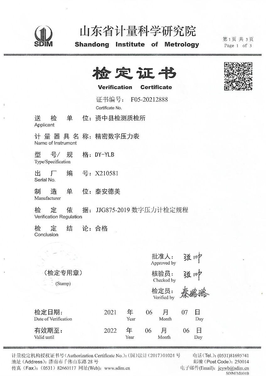 | 上一條:南昌計量檢定站-數(shù)字壓力校驗(yàn)儀 | 下一條:水三相點(diǎn)瓶凍制與保存裝置校準(zhǔn)證書 |